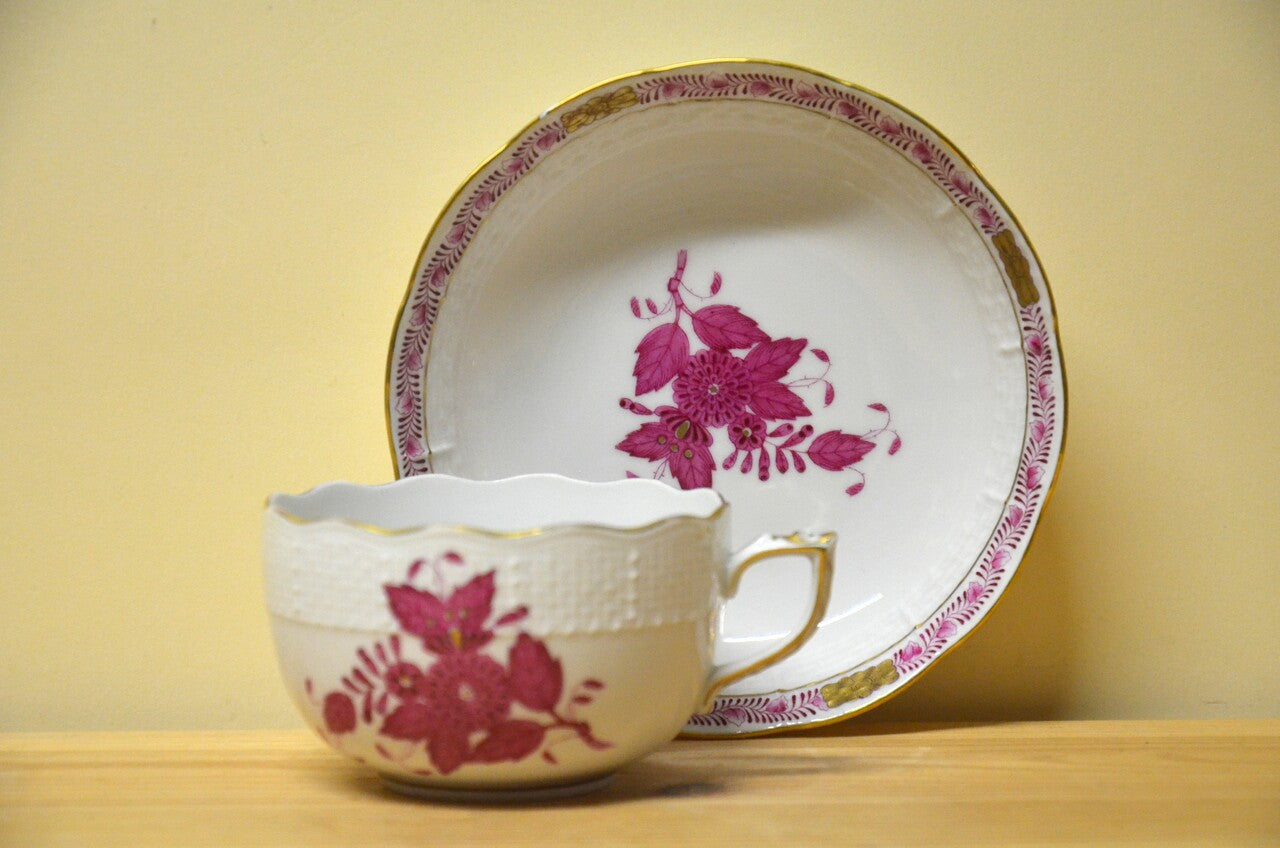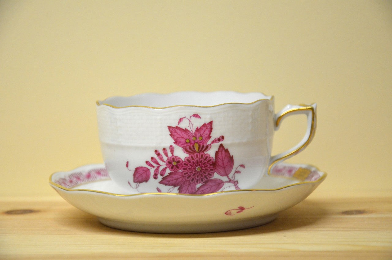 Das Ungarische Meißner Porzellan wird bei Herend gefertigt. Feinstes Porzellan wird mit wunderbaren Dekoren versehen. Dieses Dekor mit purpuren Blüten, umrahmt mit Gold ist an Eleganz nicht mehr zu überbieten.